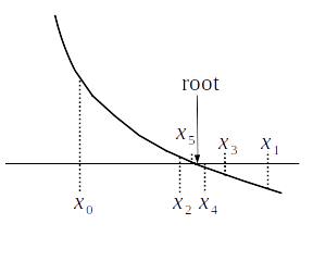 Alternatively, we can use the tolerance based on the function value. If the function value is close enough to 0, that is \(|f(x_M)| < \text{ftol}\), we stop the iteration. When the slop of the curve near the root is small, xtol works better. In the opposite case, ftol is better. cannot It is better to set the maximum number of iteration just in case the termination condition never be satisfied.